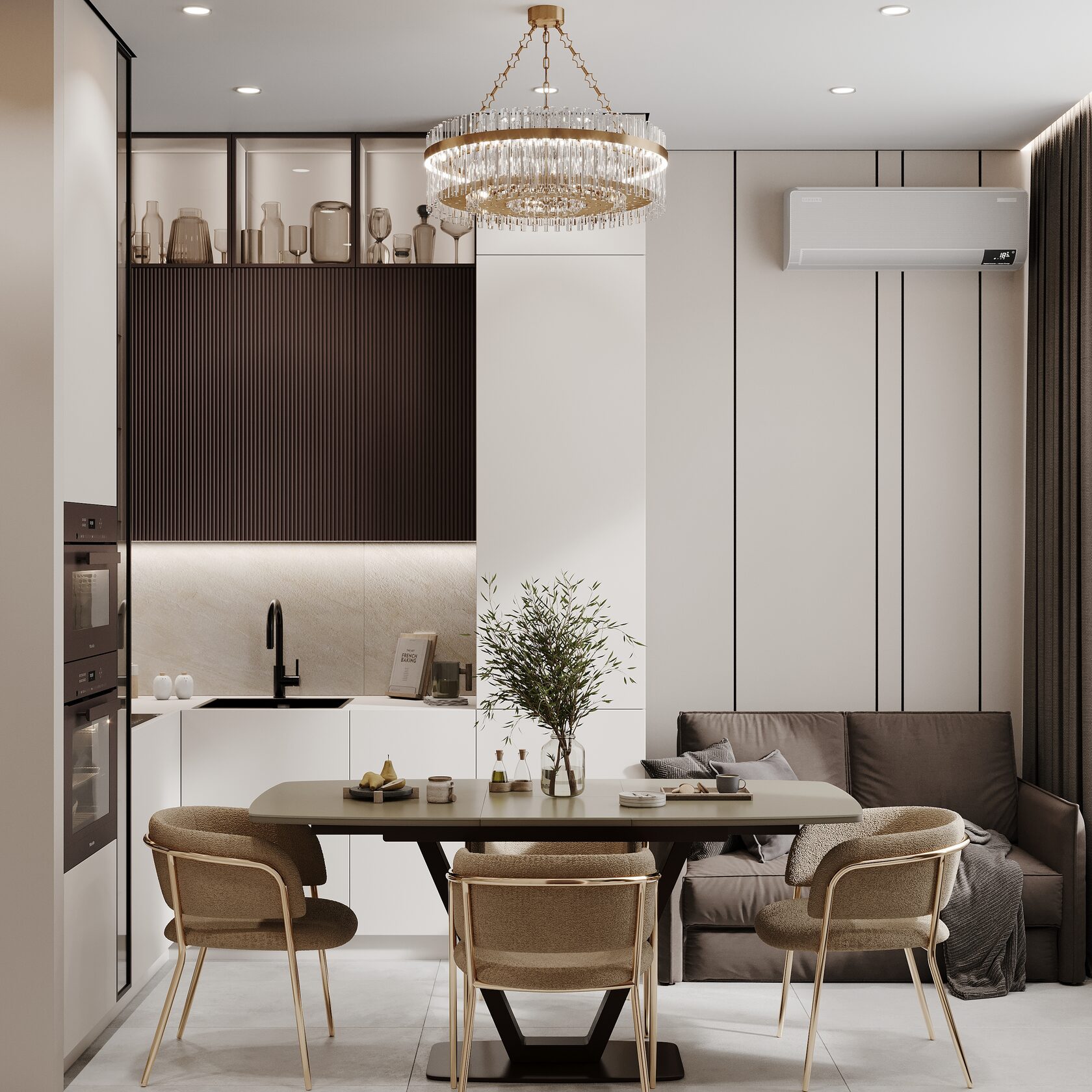 Освещение было ключевым элементом дизайна. Мы предложили неоклассический подвесной светильник над столом и добавить точечные светильники по всему пространству. Это решение позволило создать мягкое, уютное освещение и выделить основные зоны квартиры.