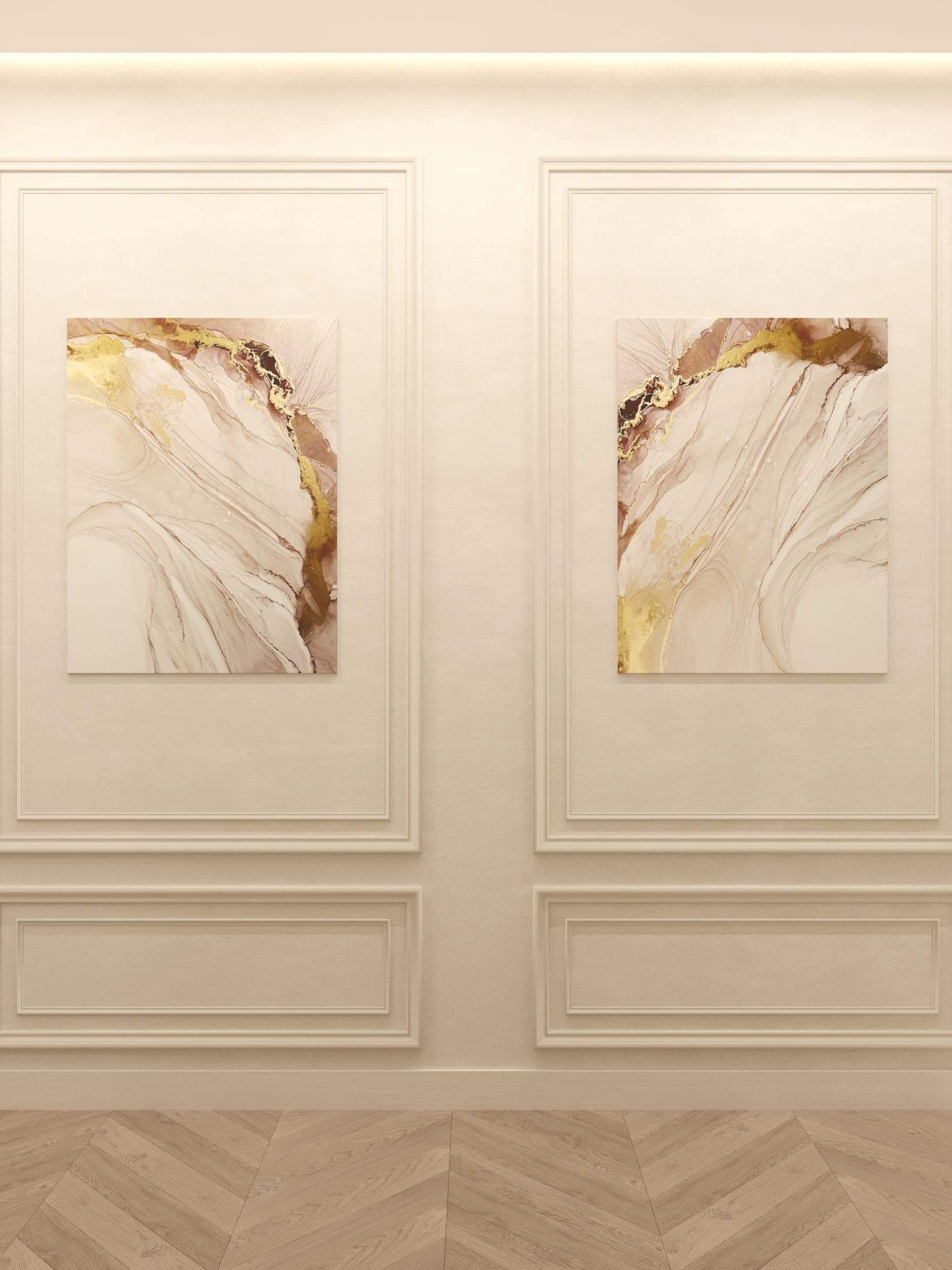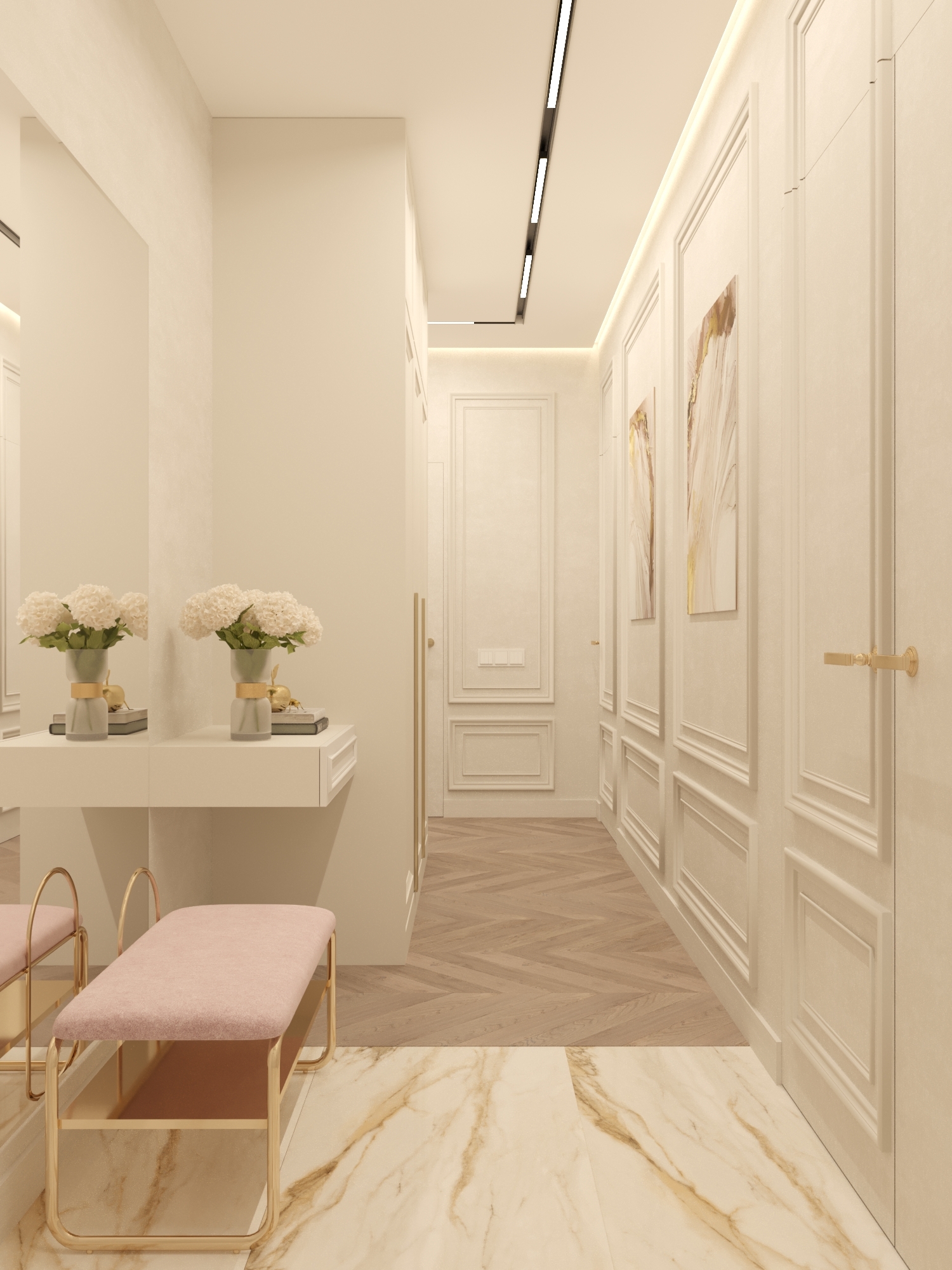 Мы начали с выбора цветовой палитры. Заказчики предпочли светлые и нейтральные оттенки, такие как нежно-белый, бежевый и светло-серый, в сочетании с золотыми акцентами. Это создавало впечатление легкости и одновременно роскоши. Чтобы дополнить это, мы выбрали краску с теплым ванильным оттенком и настенные молдинги, которые придавали помещению изысканный вид.