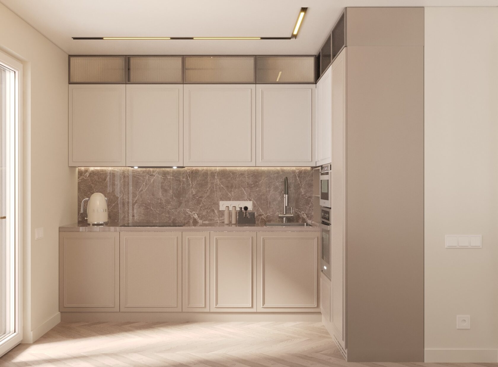Кухня также стала настоящим шедевром: мы изготовили современную мебель, с фрезерованными фасадами и утончёнными матовыми стеклянными фасадами. Кухонный остров был оформлен в тёплых тонах, а его столешница из камня придавала элегантность. Мы предусмотрели много мест для хранения, чтобы кухня оставалась функциональной и удобной для готовки.