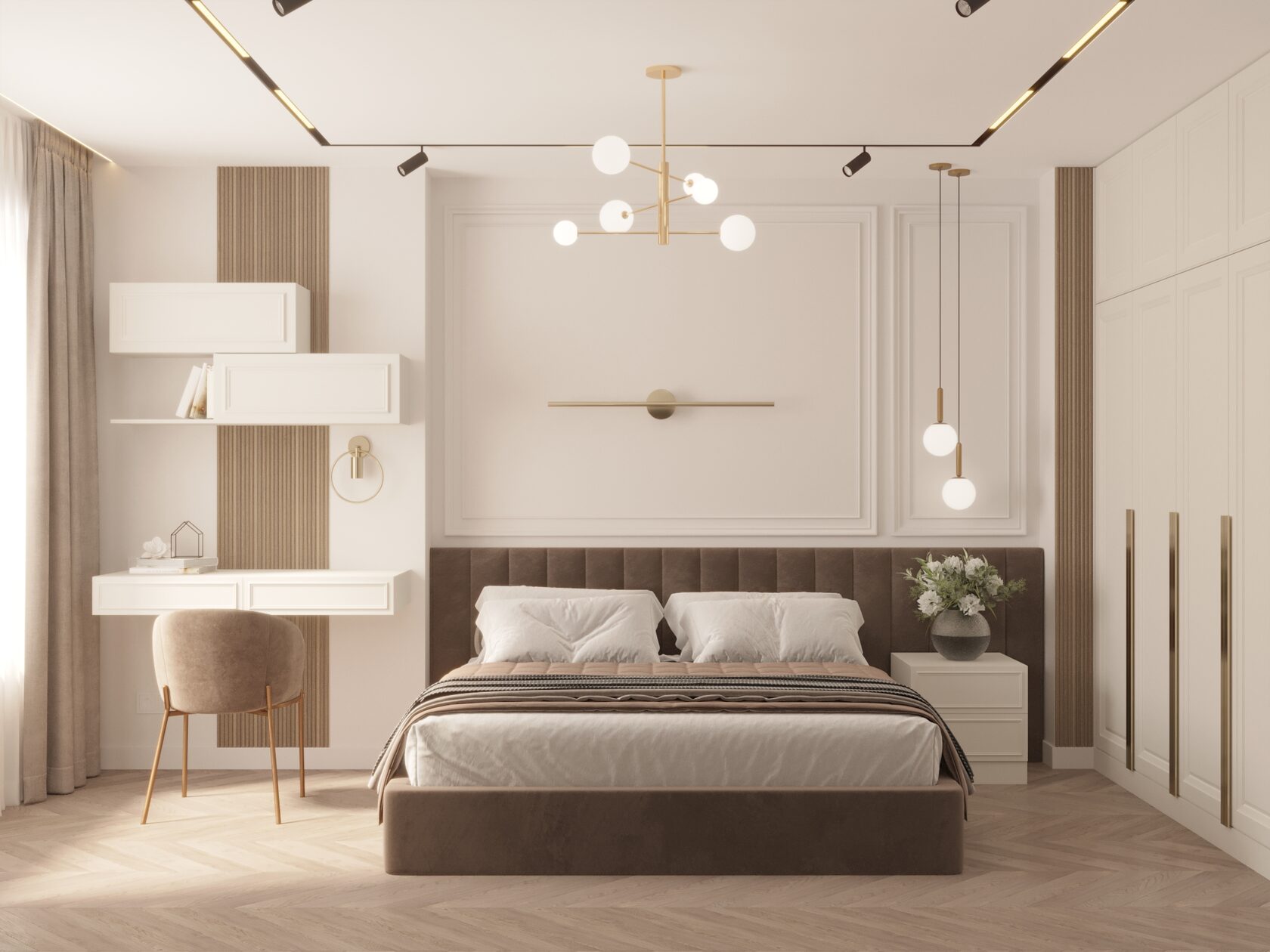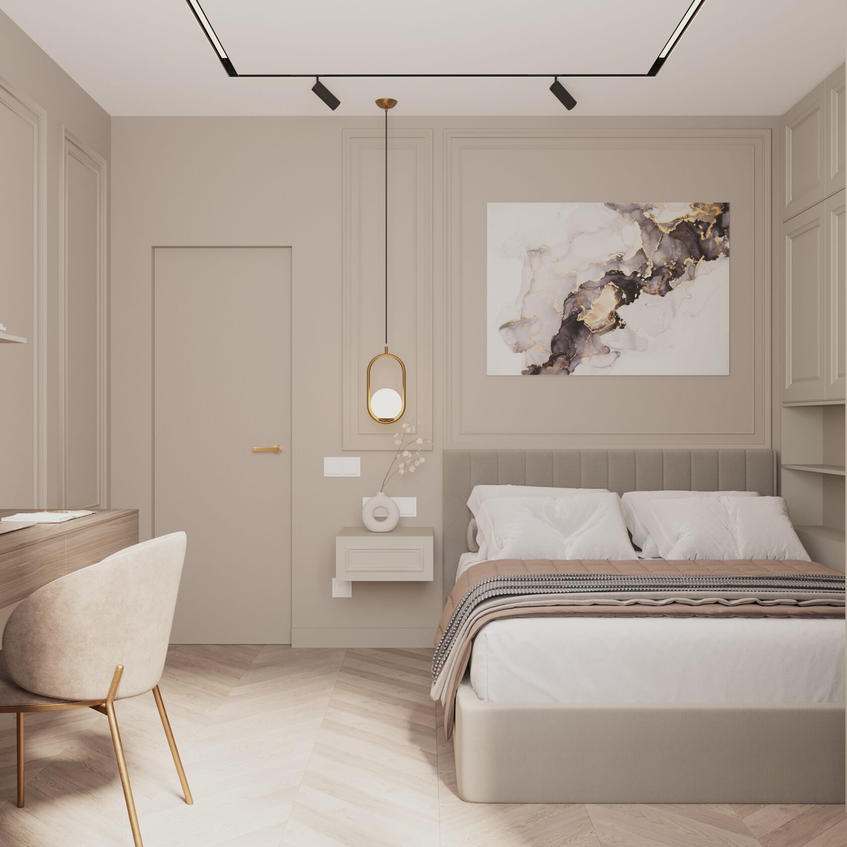 В спальне мы создали атмосферу уюта, используя мягкие текстильные элементы и светлую палитру. Оформили рабочую зону и места хранения в единым стиле.
