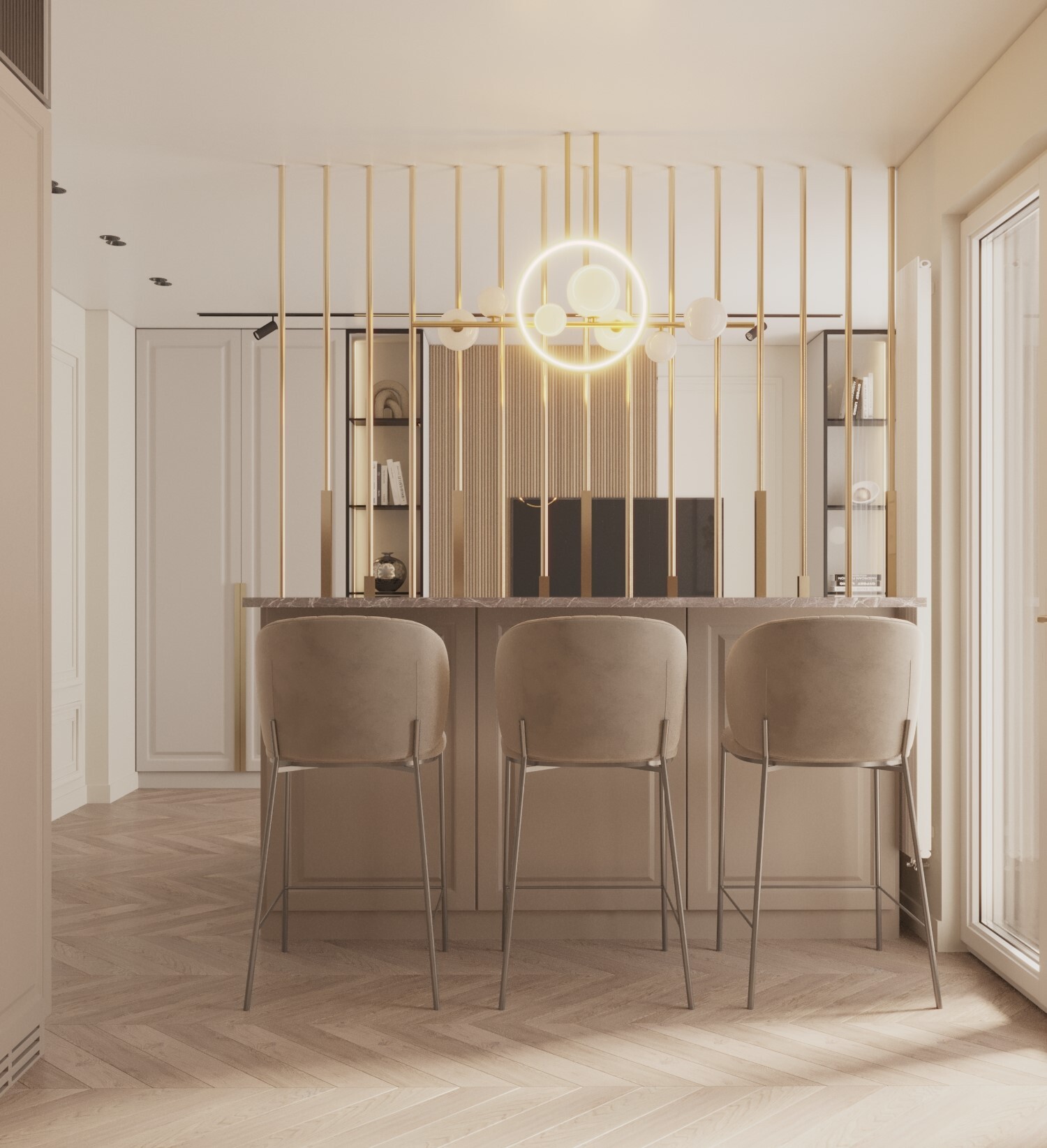 Гостиная была центральной частью проекта. Мы разработали концепцию с открытым островом, который визуально отделял кухню от зоны отдыха. Золотая перегородка, выполненная из металлических элементов, добавила изюминку и мягко разделила пространство, сохраняя при этом общую атмосферу.