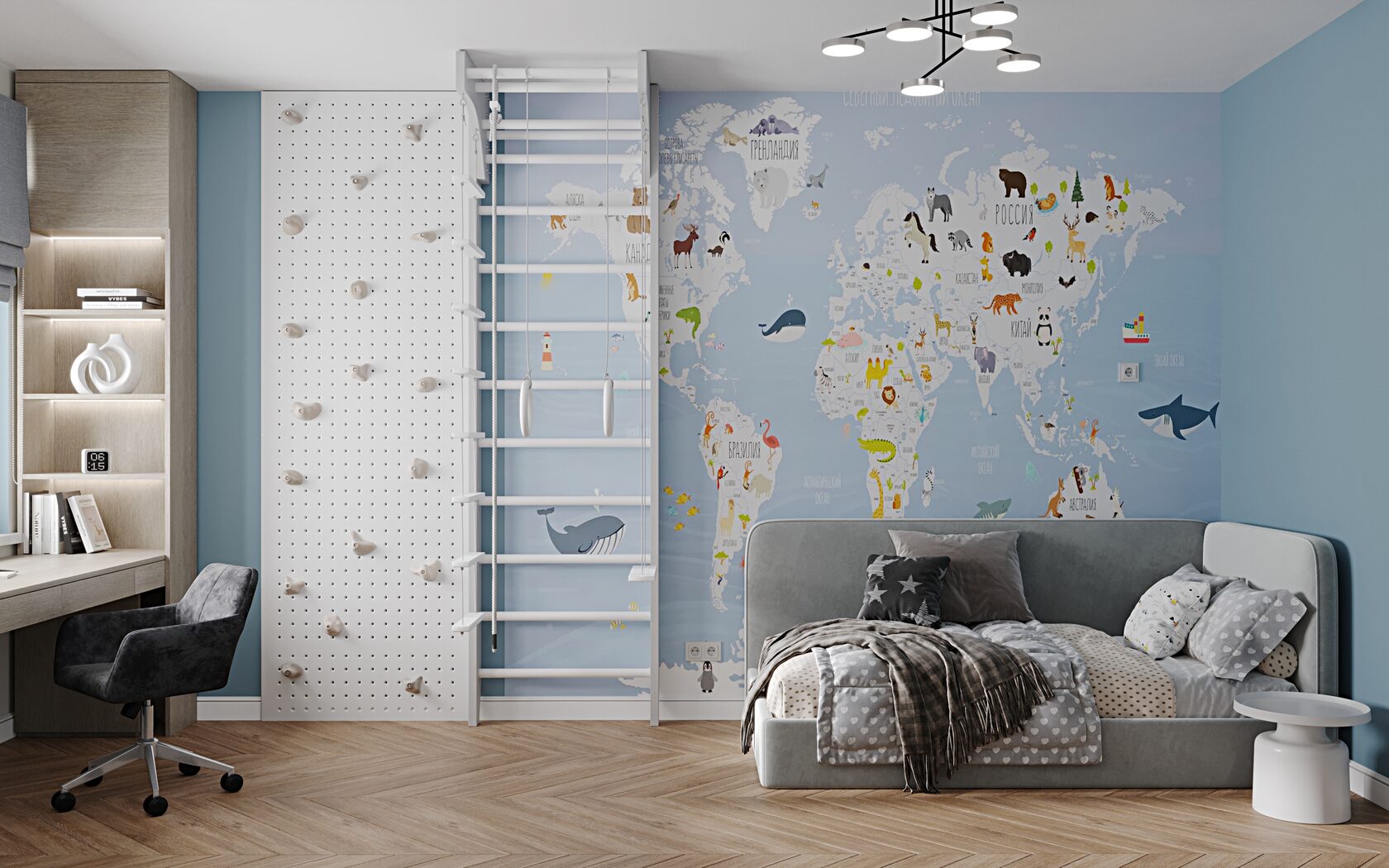Заказчики хотели, чтобы в квартире было много мест хранения, так как с двумя маленькими детьми такое решение было просто обязательным. Мы решили использовать встроенные шкафы там, где это возможно, что поможет экономить пространство. Кроме того, мы спроектировали отдельные зоны для игр детей, чтобы они могли весело проводить время, не мешая родителям.