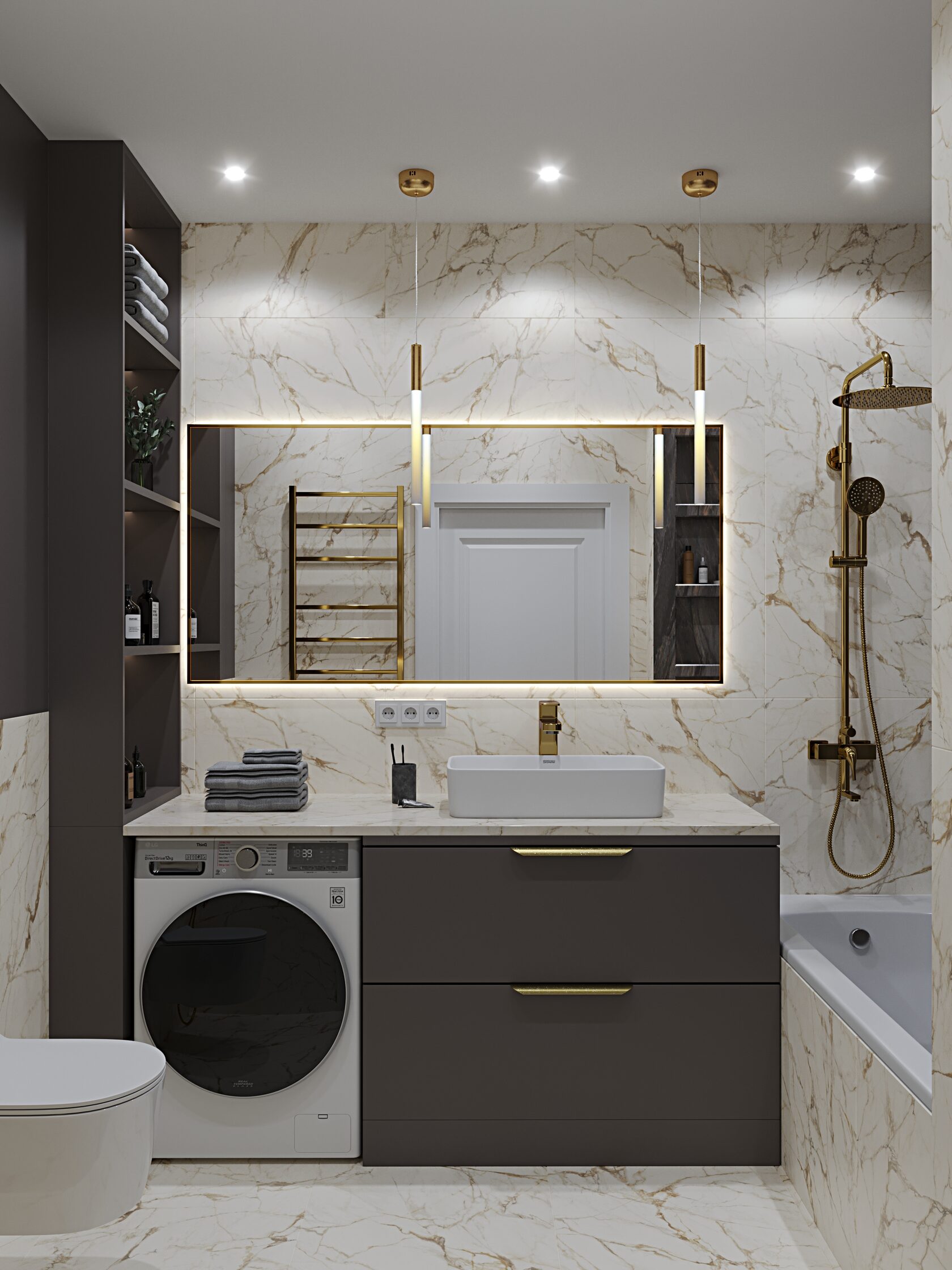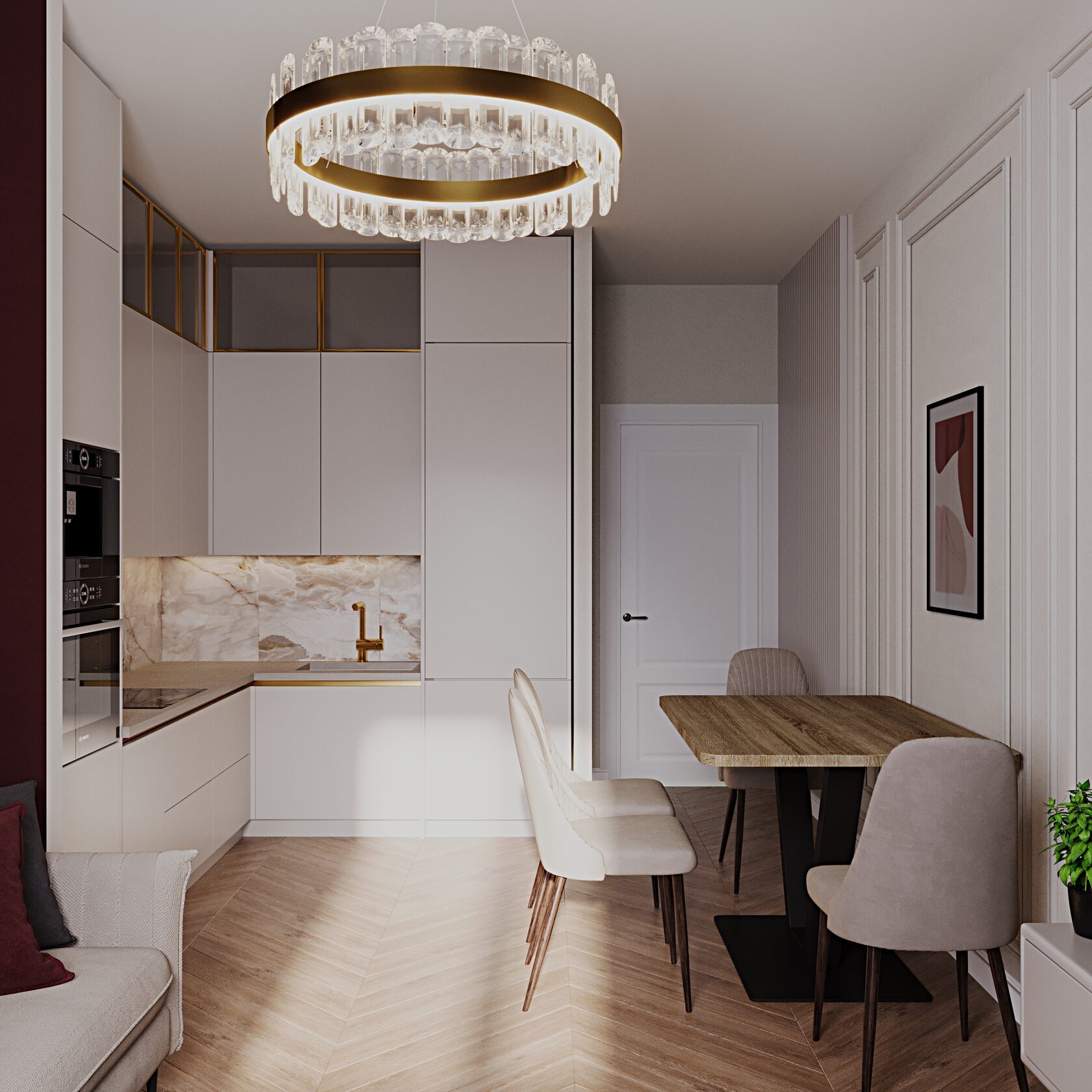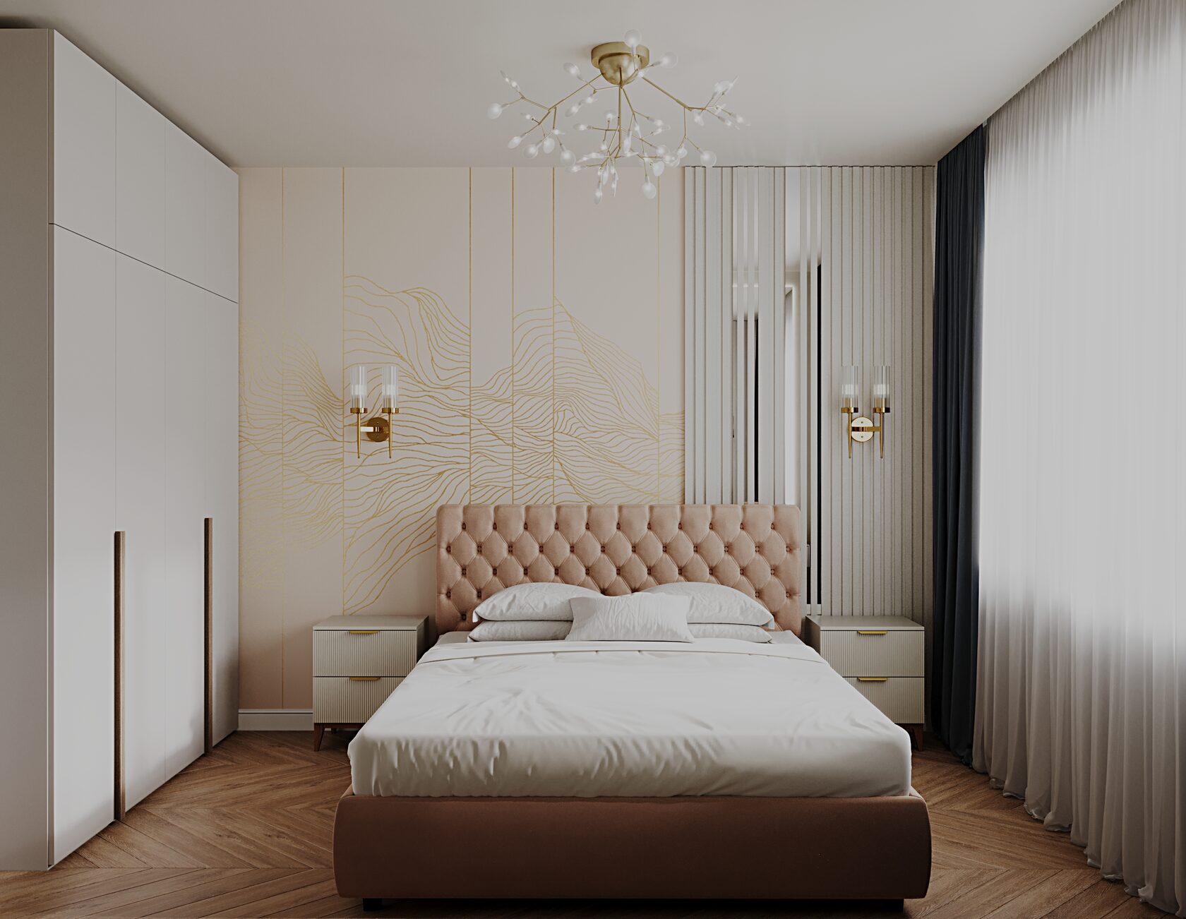 Светильники в интерьере играли свою роль. Мы подобрали стильные настенные бра и центральные люстры с золотистыми элементами, которые добавляли нотки роскоши, соответствуя основному стилю. Теплое освещение сделало комнаты ещё более уютными и приятными для жизни.